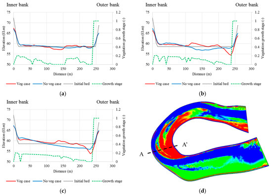 Cross sectional bed changing depending on vegetation and peak discharge. (a) MF (690 m3/s) peak discharge; (b) AMF (1381 m3/s) peak discharge; (c) EF (2762 m3/s) peak discharge; (d) location of cross section A-A’.