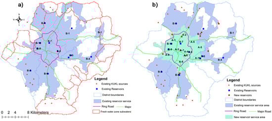 KUKL has planned to serve the KV through existing as well as new service reservoirs, as shown in Figure 1. In 2017, all service areas had limited water supply through existing reservoirs; only SA B-5, 6, 7, and 10 met the basic human water requirements. None of the SAs met the water required for economic growth. After the first phase of MWSP in 2018, the water supply situation is expected to improve significantly within the inner part of the ring road as this area will be served with water from new reservoirs (the red dots in Figure 1b) through an improved distribution network. After the first phase of MWSP, all SAs could meet the basic human water requirement and only SAs B-5 and B-6 could meet the required water for economic growth. This shows that even after 170 MLD additional water after the completion of the first phase of MWSP, most SAs will still face water scarcity.