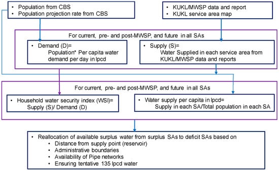 Overall methodological framework (KUKL: Kathmandu Khanepani Upatyaka Limited, MWSP: Melamchi Water Supply Project, SAs: Service Areas, lpcd: liter per capita per day, CBS: Center Bureau of Statistics).