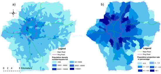 In this study, 2011 population data from the census were taken as the base and the population for future periods was projected based on the projection rate estimated by CBS. Results show a higher population density inside the ring road and along the major road network (Figure 3a). The percentage annual growth rate adopted for this study is as shown in Figure 3b; the higher value in the periphery of the ring road, where physical infrastructures like road, hospital, and schoolwere already developed and free land space is available for residence.