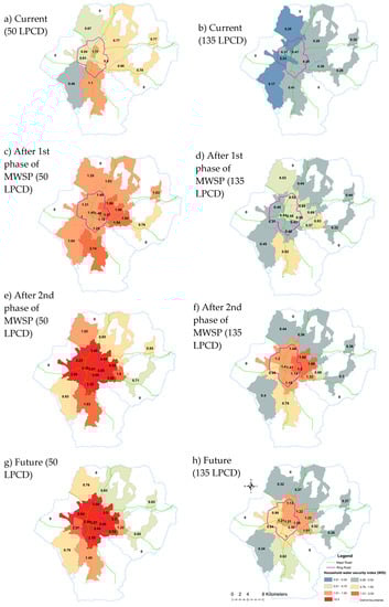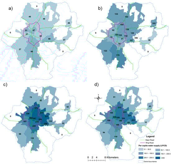 Per capita water supply (lpcd) in each service area: (a) current (2017), (b) after the first phase of MWSP), (c) after the second phase of MWSP, (d) post-MWSP (2030 or sustainable development target year).