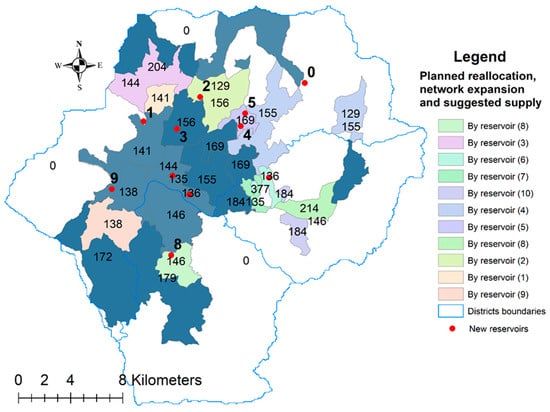 The per capita water supplied in the SAs served by new reservoirs is comparatively higher than the existing reservoirs in 2030. The possible water redistribution is shown by a different color than the original serviced area (light blue), as shown in Figure 6. After redistributing water from surplus to deficit reservoirs out of the existing reservoir SAs, it is seen that 90% of water harnessed for SA B-3 can be used for an expansion of SA in no-service areas (white area in Figure 6). Similarly, the water available in SA B-5 can also be used for SA expansion. Redistributing available water in new reservoirs in the way shown in Figure 6 can serve an additional 1.21 million people in the periphery of current improved distribution networks. Redistribution is done with existing available resources and MWSP water. The additional water available from hills and existing networks’ surplus water from SA B-3 and B-5 can be used for expanding the KUKL’s existing SAs with good-quality water for the entire KV. In addition to this, water loss from the KUKL system needs to be reduced to minimize the non-revenue water loss. Sometimes the poor management of physical infrastructure is not suitable to satisfy users, which leads to water insecurity. Water loss is a phenomenon frequently observed within water distribution networks [34]. Low pressure throughout the network does not satisfy the demand of users, but on the other hand excessive pressure causes water loss. To solve this problem, we can insert special hydraulic machines, pumps at turbines, throttle control valves, and pressure reduction valves [35,36].