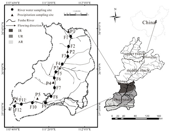 Twelve sampling sites are situated in the lower reach of the Fenhe River according to the basin’s topographic features and hydrological characteristics. F1, F2, F3, and F4 are in the IR; F5, F6, F7 and F8 are in the UR; and F9, F10, F11 and F12 are in the AR. The sampling sites were pinpointed with handheld GPS devices in the field (Figure 1). Six water samples were collected at each sampling site with a frequency of once every 2 months from July 2015 to June 2016. River water was collected at a depth of 50 cm in the central stream with an organic glass water collector (WB-PM, Beijing Purity Instrument CO., Ltd., Beijing, China). In order to determine the source of contaminants accurately, industrial sewage, domestic sewage, livestock manure, fertilizer and precipitation were collected in the study area. The industrial sewage was collected at the sewage outfalls of the main factories, domestic sewage was collected at the sewage outfalls of the urban residential area, livestock manure was collected at sheepfolds and pigsties, and fertilizer was collected in the farmland during the fertilization season; the main chemical compound of the fertilizer in the lower reach of Fenhe River was CO(NH2)2; NH4Cl and NH4NO3 precipitations were collected at the hydrological stations of Fenhe River when it rained.