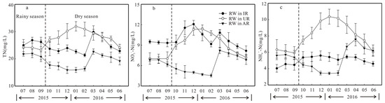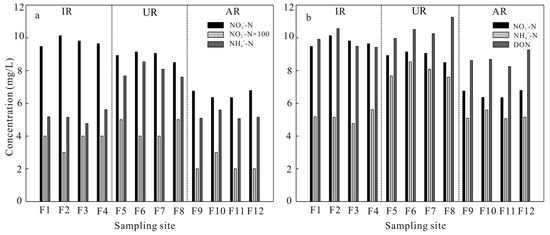 Total nitrogen (TN) is defined as the total amount of DIN and dissolved organic nitrogen (DON) in water. The TN concentration is one of the important indices to measure water quality [37]. In this study, the TN concentration in the IR was 26 ± 1.6 mg/L in the rainy season and 24.4 ± 3.0 mg/L in the dry season, while the TN concentration in the UR was the highest among the three regions, with mean values of 23.9 ± 3.1 mg/L in the rainy season and 28.6 ± 3.2 mg/L in the dry season, which means that the river water in this region is extremely polluted. The TN concentration in the AR was the lowest among the three regions, with mean values of 21.5 ± 1.5 mg/L in the rainy season and 20.2 ± 4.9 mg/L in the dry season. The seasonal variations in the TN concentration were not obvious in the AR, while the seasonal variations among the three regions were clear, which was mainly due to the different land use types along the riverbanks. There was no clear variation in the nitrogenous species concentration between the rainy season and dry season in the AR. This is due to the insignificant change in the solute content buffered by the wide river channel and slow water flow in the AR.