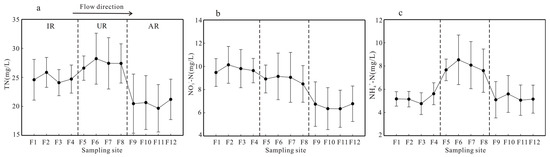 Spatial variation in (a) total nitrogen (TN), (b) NO3−–N, and (c) NH4+–N concentrations in the lower reach of Fenhe River. The error bars represent standard deviation. IR: industrial region; UR: urban region; AR: agricultural region.