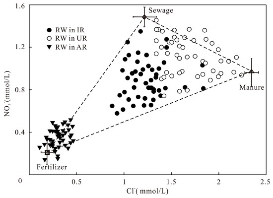 Mixing diagram of NO3− and Cl− concentrations. The means and standard deviations are shown for sewage, fertilizer, and manure. RW in IR: river water in industrial region; RW in UR: river water in urban region; RW in AR: river water in agricultural region.