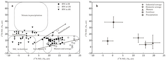 The main sources of nitrate include manure, sewage, fertilizers, and atmospheric deposition; δ15N–NO3− and δ18O–NO3− are ideal geochemical tracers that can be used to identify the origin and transformation of nitrate [47,48]. For all samples in the IR, δ15N–NO3− values ranged from 2.8‰ to 15.5‰ with a mean value of 12.5‰, and δ18O–NO3− values ranged from 3.9‰ to 14.6‰ with a mean value of 9.6‰. For all samples in the UR, δ15N–NO3− values ranged from 7.7‰ to 22.3‰ with a mean value of 16.5‰, and δ18O–NO3− values ranged from −1.0‰ to 17.5‰ with a mean value of 8.3‰. For all samples in the AR, δ15N–NO3− values ranged from −7.8‰ to 11.9‰ with a mean value of −1.3‰, and δ18O–NO3− values ranged from 3.9‰ to 31.3‰ with a mean value of 15.7‰.