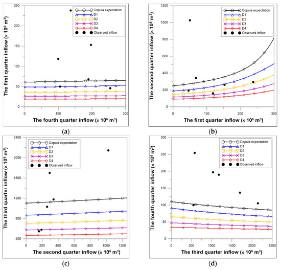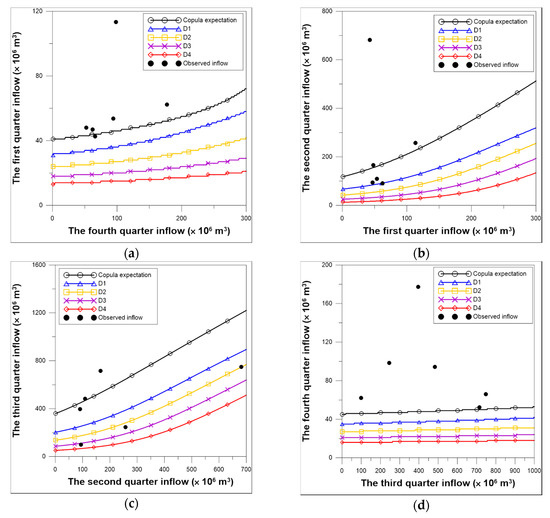 The previously determined probability distribution of quarterly inflow and the Gaussian copula function were used to create the two dams’ copula-based Bayesian networks. Figure 9 and Figure 10 show the quarterly inflow forecasting curves conforming to drought stages that were determined using the networks. In the figures, the horizontal axis denotes the previous quarter’s inflow, and the vertical axis denotes the next quarter’s inflow. The black circles in the figures show the observed quarterly inflows from 2011 to 2016. In Figure 9b, the second quarter inflow forecasting curves conforming to drought stages show a trend due to the effect of the correlation coefficient of inflow between the first and second quarters. There, however, are few such trends for the other quarters. Looking at the forecasting curves of the third quarter inflow conforming to drought stages (Figure 9c), there are two observed quarterly inflows that are much less than the other observed quarterly inflows. The two values, which represent the observed inflows in the third quarters of 2014 and 2015 during severe droughts at the Soyanggang dam, are located close to the curve that corresponds to the drought stage of D3. If a drought had occurred in the second quarter of 2014 and 2015 and a drought was forecast for the third quarter, it would have been possible to forecast adequately the quarterly inflows corresponding to these two observed values. The observed quarterly inflows in the fourth quarter are substantially larger than those indicated by the quarterly inflow forecasting curves (Figure 9d). Since the average of these inflows is about one-ninth of the average of the observed quarterly inflows in the third quarter, the above errors do not significantly affect the water supply operation of the reservoir.