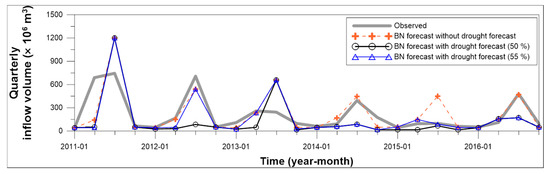 The solid line of triangular symbols in Figure 14 shows the results when the threshold probability of drought occurrence is increased to 55% in the case of the Andong dam to improve the tendency to forecast small amounts of inflows for many quarters. The quarterly inflow forecasts were surely larger and produced smaller absolute errors for the third quarter in 2012 and the second quarters in 2013 and 2015. The absolute error of the inflow forecast for the third quarter of 2015, when an extreme drought occurred, was further reduced to 9.4% (Table 6). The forecast inflows of the third quarter in 2014 and 2016 were smaller than the observed values. If, in such a case, the actual quarterly inflow increases, the drought response measures are withdrawn and water supply is normally carried out, resulting in very little damage to the water user.