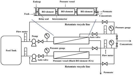 The RO test system, equipped with two parallel sets of pressure vessels and located in A Steel (Dangjin City, Korea), was used for the pilot test study. The schematic of the pilot test apparatus is shown in Figure 1, and the test system is the same as that of the previous study with the exception of the retentate recycling loop []. The pilot RO system operation was conducted with an identical feed facing mode that enabled the separate parallel assessments of the two pressure vessels, and each vessel was installed with RO elements comprising different permeate flow rates. Each pressure vessel contained three commercial 8-inch diameter RO elements in a series manner, and the individual RO elements possessed an effective membrane area of 400 square feet.