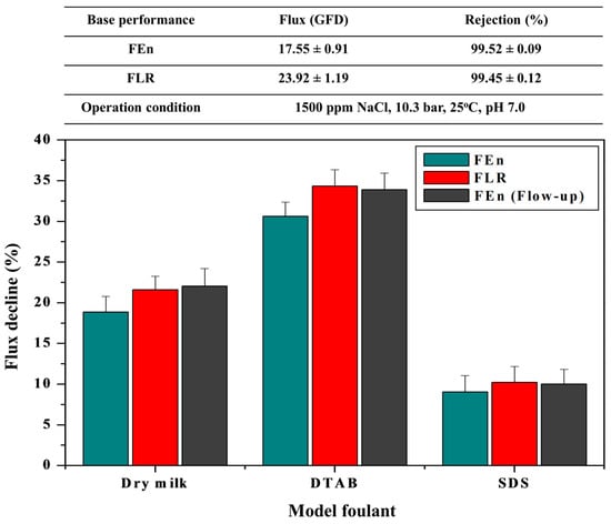 Flux decline comparison between the FEn and FLR adopting model foulants (Operation conditions: 1500 ppm NaCl, 10.3 bar, 25 °C, model foulants 50 ppm dry milk, 5 ppm DTAB, 50 ppm SDS, respectively).
