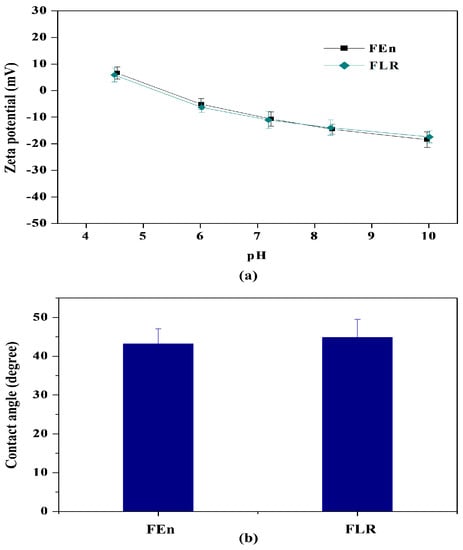 The surface morphology analysis results from the AFM also showed a comparable trend. The definitions of projected area and mean height are defined as the product of x and y range in the selected area scanned by AFM and the average height of the height profiles within the area, respectively. As described in Table 3, both the root mean square roughness (Rms) and the peak-to-valley (Rp-v) distance of the two membranes did not reveal major differences. To summarize, both the FEn and FLR membranes exhibited quite similar surface characteristics, such as the structural morphology, surface charge, hydrophilicity, and fouling resistance, with the permeate flow rate being the only exception.