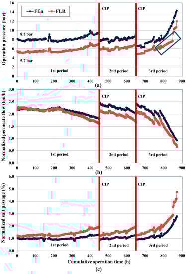 The normalization of flow rate and salt passage was conducted to determine the noticeable variations in the system performance that originated from the membrane fouling. The NPF of both vessels was maintained constantly without a noticeable change until 200 h of operation (Figure 6b), but a gradual decreasing tendency was confirmed after 200 h operation. The FLR adopted vessel exhibited a larger NPF decline compared with the FEn during the first operation period. Similar to the operating pressure variation case, the FEn vessel showed increased NPF values at the start-up points of the second and third periods due to the CIP induced swelling effect. The NPF difference between the two vessels at the start-up point of the second operation period is more enhanced after the conduction of the CIP, which suggests that a more intensive fouling (less cleaning efficiency) occurred in the FLR vessel during the first operation period; and this trend is similar to the operating pressure drop confirmed in Section 3.2. Compared to the operating pressure variation depicted in Figure 6a, however, the NPF variation is much more relieved in the third period of operation, because the NPF calculation accounted for the flow rate variation that was induced by the water temperature fluctuation.
