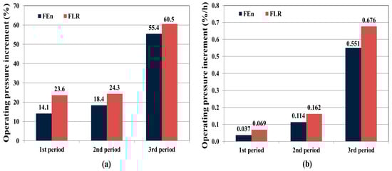 Operating pressure increment comparison between the FEn and FLR based on the segmented operation period: (a) Operating pressure increment (%) between initial start-up and end-point of each periods; (b) Operating pressure increasing rate (%/h) of each periods.