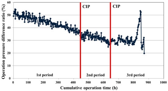 where PFEn is operating pressure of FEn and PFLR is operating pressure of FLR, respectively. As can be seen in Figure 6a, the feed pressures at the initial point of operation are 8.2 bar for the FEn vessel and 5.7 bar for the FLR vessel. The initial operating pressure difference clearly originated from the inherent flow rate difference of both RO elements. However, as can be seen in Figure 8, the operating pressure difference ratio between the two vessels became smaller as the cumulative operation time was increased. At the initial stage of operation, a roughly-50%-higher operating pressure was needed for the FEn vessel to meet the designed permeate flow rate 2.2 ton/h, but the pressure difference gap ratio decreased to approximately 32% during the first period of operation (start-up to 448 h). The CIP conducted at the end of the first period could not recover the initial pressure difference ratio between the two vessels, and the decreased pressure difference ratio was almost maintained during the remaining operation period (448 h to 872 h); this is mainly due to the fact that the FLR vessel exhibited a higher operating pressure increasing tendency compared with the FEn vessel. The fluctuation of the operating pressure difference ratio during the third operation period was caused by the previously described permeate stream autovalve error of the FLR installed RO array. Noticeably, the least pressure difference was estimated at the end-point of the third operation period, which could be considered as the most severe fouling occurrence condition. As previously described, the retentate of each vessel was recycled to generate the higher fouling potential condition during the third period of operation. This result suggests that the advantage of a low-pressure RO membrane, which could lower the operating pressure, can be diminished at the high fouling potential operation condition.
