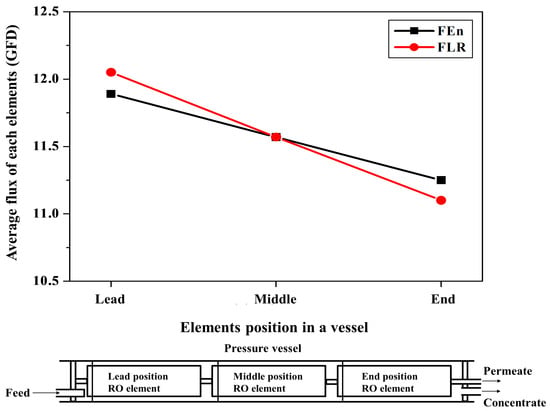 Figure 9 describes the simulation study results for the average permeate flux of the individual elements in a pressure vessel using RO system design software CSMPro 5.0. The flux variation behaviors of the FEn and FLR were compared according to the element position in a vessel. Both cases showed the highest average flux for the lead position element and the lowest average flux for the end position element. Considering the increased feed water concentration and the NDP decline that were caused by the filtered water through the fore positioned elements, the lowest flux of the end position element is quite reasonable. Notably, the FLR case exhibited the larger average flux difference between the lead and end position elements compared with the FEn. The localized working load within a pressure vessel that is due to an uneven individual element average flux may accelerate the fouling of the lead position element, which could lead to an enhanced salt passage. The membrane fouling propensity increased with the operational flux. Consequently, the higher flow rate operation of the lead position element of the FLR vessel caused a more intensified membrane fouling. Alternatively, the FEn adopted case may generate a more even working load distribution within a vessel, which enables a more stable system operation.