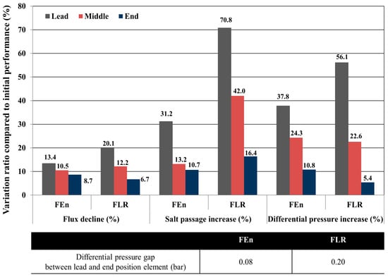 Comparison of the individual element flux decline, salt passage increase, and differential pressure variation according to the installed position in a vessel.