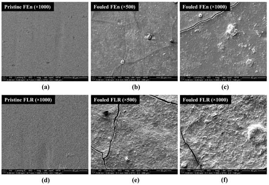 SEM images of the fouled and pristine membranes: (a) Pristine FEn (×1000); (b) Fouled FEn (×500); (c) Fouled FEn (×1000); (d) Pristine FLR (×1000); (e) Fouled FLR (×500); (f) Fouled FLR (×1000).