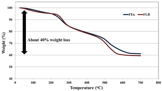Thermal gravimetric analysis (TGA) curves of the foulant samples acquired from the lead position FEn and FLR elements.