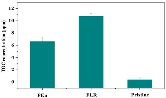 The TOC measurements of the eluted organic materials from the fouled membranes were conducted to quantitatively compare the organic fouling intensity of the two membranes (Figure 14). Fouled flat sheet membrane samples of 15 cm2, which were extracted from the lead position elements of both vessels, were stored and agitated in 100 mL of deionized water at predetermined conditions (30 °C solution temperature, 7 days soaking time), and then the eluted organic content was filtered with a 0.45 μm prefilter before it was subjected to the TOC analyzer. The averaged value of the six experimental TOC analysis runs was calculated. The FLR case showed a higher eluted organic substance concentration than the FEn case. It could, therefore, be concluded that the LPRO operation treating the high fouling potential feed water evidently increased the fouling propensity to the organic foulants. Notably, the pristine membrane sample that was adopted as a reference also exhibited low organic concentration levels; this seems to be due to the trace of the residual chemicals that were applied for the polysulfone support and the polyamide thin layer formation in the RO membrane preparation process. However, these residual chemicals should be thoroughly washed out during the RO element performance measurement and flushing processes.
