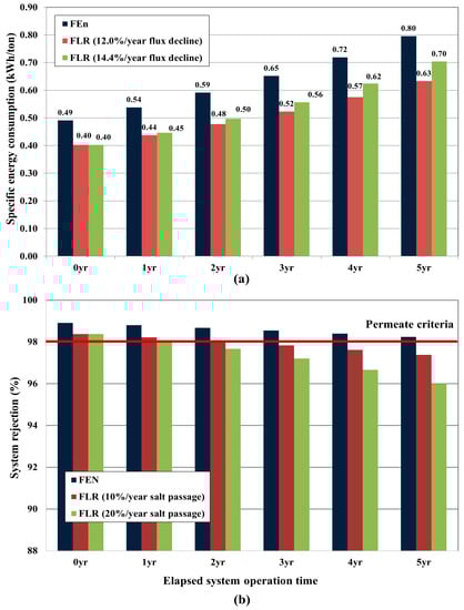 Figure 15a shows the annual specific energy consumption (kWh/ton) estimation result of the simulation studies. The specific energy consumption (operating pressure) of FEn case was 22.5% higher than those of FLR cases at the beginning of the system operation (0 year). When comparing the FEn and the 12%/year annual flux decline FLR case, the difference in the operating pressure (expressed as specific energy consumption) was predicted to increase from 22.5% (0 year) to 27.0% (5 year) as the operation year elapsed. Consequently, the average operating difference ratio was calculated as 24.4% during entire operation period (5 years). On the other hand, an additional FLR based simulation study for which adopting the annual flux decline setting as 14.4%/year exhibited considerably different variations. In this case, the operating pressure difference ratio was expected to decrease from 22.5% (0 year) to 14.3% (5 year) as the operation time elapsed, and the average operating pressure difference ratio was calculated as 17.8% during the same operation period. As a result, it could be confirmed that the energy saving advantage of the LPRO application could be significantly reduced in the long-term operation. Although it was predicted that the FLR was fairly advantageous for lowering the operating pressure at the initial stage of system operation, it was necessary to make a comprehensive judgment with considering the enhanced flux decline accompanied by the frequent CIP intervals and the following product water quality issue.