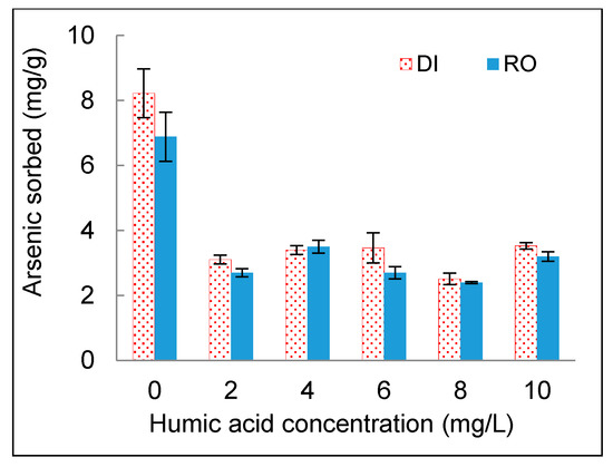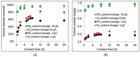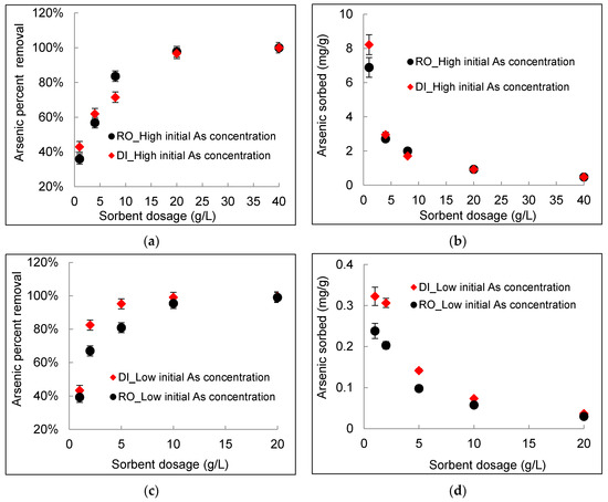 - The percent removal of arsenic increased significantly with an increasing DWTS dosage from ~40% removal at a 1 g/L sorbent dosage to greater than 95% removal at a sorbent dosage of 20 g/L. However, the sorption capacity decreased with an increasing DWTS dosage. For example, for a high arsenic concentration of 20 mg/L, the amount of arsenic sorbed decreased from 6.8 mg/g in RO concentrate and 8.2 mg/g in deionized water at 1 g/L sorbent dosage to 0.92 mg/g at sorbent dosage of 20 g/L for both water matrices. For a lower arsenic concentration of 0.7 mg/L, the amount of arsenic sorbed decreased from 0.32 mg/g in deionized water and 0.24 mg/g in RO concentrate at 1 g/L sorbent dosage to 0.03 mg/g at a sorbent dosage of 20 g/L for both deionized water and RO concentrate.