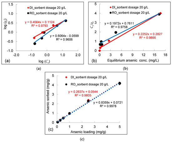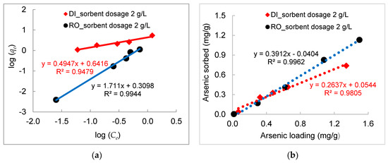 - Experimental data fitted well to the Freundlich equation, demonstrating a multilayer adsorption process between arsenic in water and DWTS due to surface precipitation of calcium arsenate and the formation of ternary complexes between arsenic and NOM bounded by polyvalent cations (e.g., Fe, Al) in DWTS. The maximum sorption capacities calculated from the Langmuir isotherm in RO concentrate and deionized water were 169 mg/g and 172 mg/g, respectively.