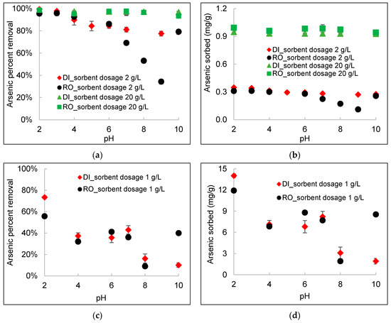 - At a high DWTS dosage of 20 g/L, no pH-dependent behavior was observed within the pH range of 2–10 because of the abundant sorption sites in DWTS. For a low DWTS dosage of 1–2 g/L, the sorption of arsenic increased substantially as the pH decreased, except at pH 10, in RO concentrate. Precipitation of calcium arsenate at a higher pH (>10) increased arsenic sorption onto DWTS in the presence of a high concentration of calcium in RO concentrate.