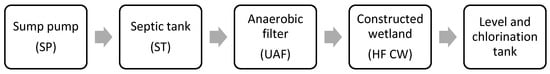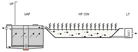 Wastewaters flowing to an up-flow anaerobic filter (UAF) and then to a horizontal subsurface constructed wetland (HF CW).