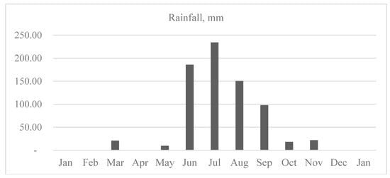 Water quality parameters were monitored at the entrance of the system, at the outlet of every treatment unit, and at the end of the treatment process after disinfection. Heavy metals were not monitored since potable water is used for the diverse services of the R&D center, and it was not contaminated with hazardous materials. The monitoring protocol was applied one year after its construction and operation of the treatment plant during the months of January, April, July, and October of the year 2016 and on January of 2017. The samples were taken only once in each reported month. A duplicate sample was taken at the beginning and at the end of every treatment unit. Samples were transported and analyzed in the laboratory following accredited standard methods for water examination []. The hydraulic residence time (HRT) was considered as constant along the system for purposes of analysis and discussion. The average use of water per month was calculated according with water consumption data of the R&D center finding slight variations in monthly water consumption. Pluvial water enters occasionally at the inlet of the system throughout the year. It was unavoidable that the precipitation fell over the surface of the wetland since it was constructed in an open area. The municipality of Zapopan is part of the metropolitan area of Guadalajara, it is located at 1548 m above sea level and its climate is sub-humid, with winters and dry and temperate springs. The average temperature is 23.5 °C, with a maximum of 35 °C and a minimum of 5.4 °C. The average annual rainfall is 906.1 mm, and it rains mainly between the months of June to October. During the rainfall period, the intensity of rainfall in Zapopan occurs mainly around midnight and in the early hours of the day. According with the nearest meteorological station located in the city of Guadalajara, the average monthly rainfall from January 2016 to January 2017 is shown in Figure 4.