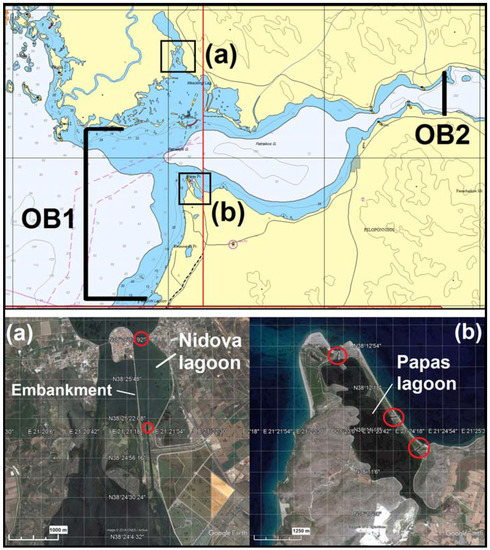 Coastal lagoons are particularly important for fisheries and extensive or intensive aquaculture in many areas of the world, since marine fish species migrate towards lagoons, which provide favorable conditions for feeding and shelter [1]. Mediterranean lagoons, specifically, are important for aquaculture activities, and make a crucial contribution to the fishery economies in many countries. In Greek waters, important fishing and extensive aquaculture activities have been developed in the majority of lagoons (30 in the Aegean and 46 on the Ionian coast), occupying a total area of about 34,500 ha [2]. The fishery exploitation is based on traditional barrier fish traps. These are permanent entrapment devices and the catches are based on the species-specific inshore–offshore seasonal or ontogenic fish migration [3]. The majority of these extensive lagoon systems are located in western and northern Greece. The largest is the Messolonghi lagoonal complex located in western Greece, comprising six lagoons. The Messolonghi lagoon system covers about 15,000 ha [4] (p. 97), while the Papas lagoon (Araxos Cape, Achaia, Greece) has a mean size of 4500 ha [5].
