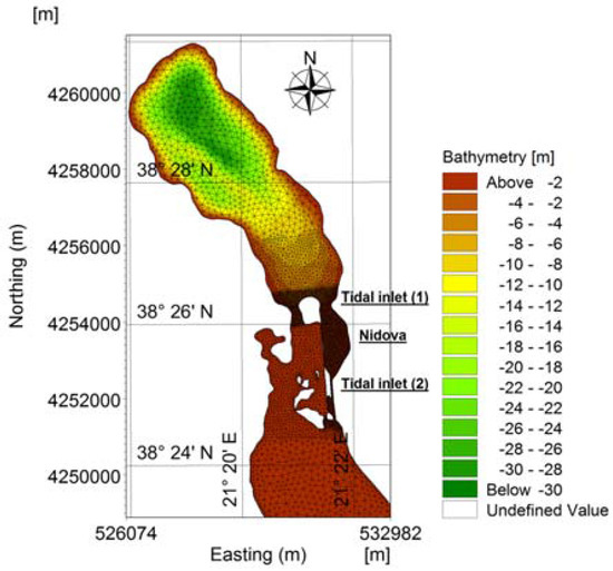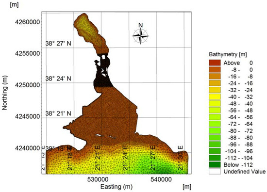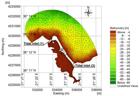The numerical domain for the three-dimensional simulations covers the entire Messolonghi–Aetoliko lagoonal system and a small part of the adjacent open waters of the northwestern part of the Gulf of Patras (i.e., the coastal waters in front of Messolonghi lagoon). This domain was discretized using a numerical grid consisting of a three-zone triangular mesh in the horizontal (Figure 2). In the first zone, covering the northwestern part of the gulf of Patras, the characteristic length is up to 400 m offshore. In the second zone, the characteristic length is 200 m and covers the greater area of the Messolonghi–Aetoliko lagoon complex, upstream and downstream of the area of interest, and in the third zone the length dimension varies from 20 to 50 m and covers the transitional part between the Messolonghi and Aetoliko lagoons, where the area of the Nidova lagoon is embedded.