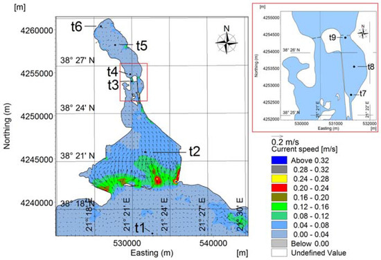 The surface flow field during flood tide into the Messolonghi–Aetoliko lagoonal complex. At the right upper corner, detail of the wider area of Nidova lagoon is shown, and numerical stations t7, t8, and t9 are marked.