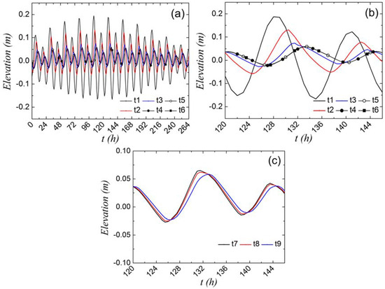 (a) Time series of tidal elevation at selected points along the longitudinal axis of the Messolonghi–Aetoliko lagoons, covering a simulation period from neap to spring tides, (b,c) detail where tidal amplitude decrease and phase lag are revealed during the propagation of the tide in the lagoonal system. The sites of the points are marked in Figure 5.