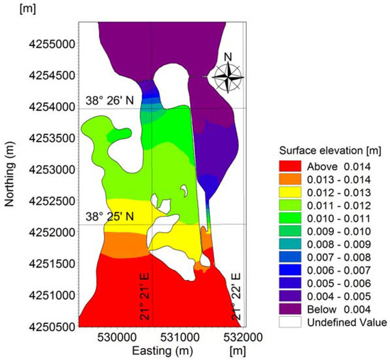 Concerning the Papas lagoon, tidal elevation time series that resulted from the two-dimensional simulations of the Gulf of Patras were used as open boundary conditions in the simulations that follow (Figure 4).