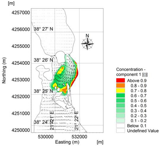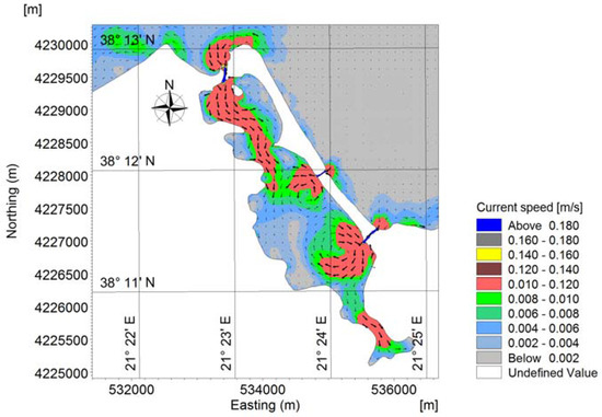 An instance of the velocity field induced by flood tide in the Messolonghi–Aetoliko lagoonal system is depicted in Figure 5, where it can be observed that surface velocities range between 5 and 12 cm/s, except in locations where the depth is very shallow. The high velocities are especially pronounced at the sand bars, i.e., in sites where tidal inlets are formed, at the entrance of the Messolonghi lagoon (from the Gulf of Patras), and are crucial for fish migration into the lagoon ecosystem.