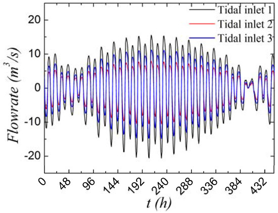 In contrast to the Nidova lagoon, the Papas lagoon is subject to a straightforward tidal forcing. It has three tidal inlets: two in the eastern side and one in the northern side of the lagoon, and all of them are exposed immediately to the semidiurnal tide of the Gulf of Patras. The distances between them are small so that both the amplitude and the phase of the tide is practically the same in all three. An instance of the velocity field induced by flood tide in the lagoonal system is depicted in Figure 9, where it can be observed that surface velocities range between 0.5 and 20 cm/s, except in locations where the flow is strongly affected by the presence of the inlets. The high velocities are especially pronounced at the three inlets and in front of these, since the tidal currents through the narrow inlets flowing into the wide lagoon form a tidal jet, often called a mushroom jet, as it generates a vortex pair. When the tide reverses (ebb flow), the pattern of the flow resembles a radial flow to a sink [36]. The hydraulic exchange flowrate between the lagoon and the Gulf’s open waters, via the three tidal inlets, is given in Figure 10. It can be seen that the exchange flowrate for the three inlets ranges between 4–6 m3/s (neap tides) and 7–15 m3/s (spring tide), with an intermediate value of 5–10 m3/s (e.g., mean tidal range).