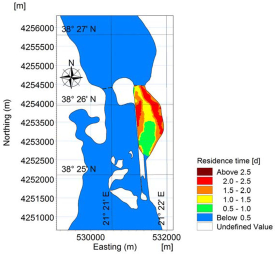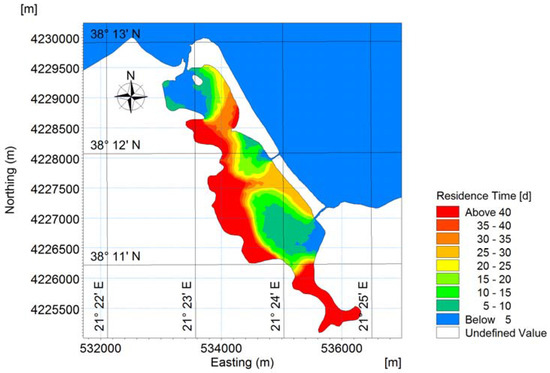 The numerical results showed that the residence time in the water body exhibits a strong spatial variation. In the region located in front of the inlets, rapid mixing occurs and these areas have the shortest residence time (~5 days). The southern, somewhat isolated shallow region and also the deeper central–western region, which is relatively far from the inlets, seems to remain at a near stagnation state for significant time intervals, having a residence time of more than 40 days (Figure 13). The hydrodynamic gyres due to tidal action cause a conservative tracer to be trapped between the two openings in the eastern side of the lagoon. In the middle area of the eastern openings, a rather unexpectedly high residence time appears. This area seems to be at a near stagnation state, having a residence time of approximately 25–30 days. It is worth noting that it is in this area, i.e., in the vicinity of tidal inlets, that the dystrophic crisis occurred in June 2012 [18], showing that the high residence time in this area is not incompatible with the local initiation of dystrophic phenomena.