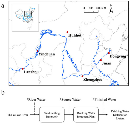 (a) Sampling locations (Lanzhou, Yinchuan, Hohhot, Zhengzhou, Jinan, Dongying); (b) Drinking water treatment processes, including sand settling reservoir and drinking water treatment. “*”: Sampling sites.