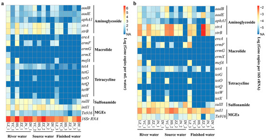 (a) Absolute and (b) relative abundances of the 17 ARGs, two MGEs, and 16s rRNA in water samples. Label under each column denotes sample site name followed by water type (1 is river water, 2 is source water, 3 is finished water).