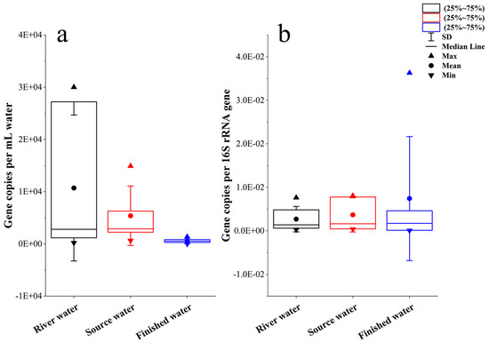 Total absolute (a) and relative (b) abundances of ARGs (copies/mL water) in river, source, and finished water.