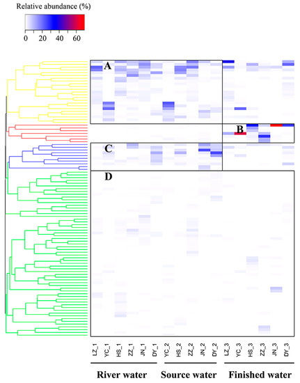 Heatmap of distribution profiles of bacterial genera across different water samples. Each row represents the results of genus percentage by sequencing. Dendrograms for the rows were constructed from the Bray-Curtis dissimilarity distance. Black boxes represent different patterns of genera: (A) widely detected in all water types, dominant in river and source water; (B) highly enriched in finished water, but rarely detected in river and source water; (C) mainly detected in river and source water, but not in finished water; and, (D) relatively low in all water types.