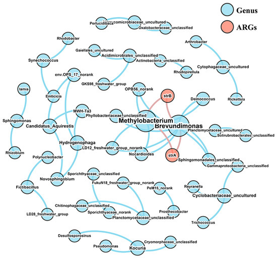 To further prove the correlation between ARGs and bacteria, the co-occurrence patterns between ARGs and bacterial taxa were investigated using network analysis, as shown in Figure 5. Two bacterial genera, Brevundimonas and Methylobacterium, were suggested as the possible hosts of two ARGs (strA and strB) (Table S10). Notably, these two genera were enriched in the finished water and their proportions were highly increased in the finished water of Zhengzhou. This may explain the increase in the total relative abundance of ARGs in the finished water sample as the strA and strB ARG subtypes in the finished water of Zhengzhou were dominant. Although Brevundimonas species has rarely been reported as a pathogen causing human infection, it has been isolated in some infection cases [41]. Methylobacterium species has been considered as a serious concern in hospitals due to its contamination of tap water [42]. There has been no report of strA-strB streptomycin-resistance of Brevundimonas and Methylobacterium yet, aminoglycosides were recommended as important treatment of Methylobacterium species infection [43]. However, since strA-strB streptomycin-resistance genes widely distribute in bacteria, and strA-strB are often encoded on transposon borne on conjugative plasmid [44], potential aminoglycosides resistance in Brevundimonas and Methylobacterium that is caused by horizonal transfer need to be further studied.