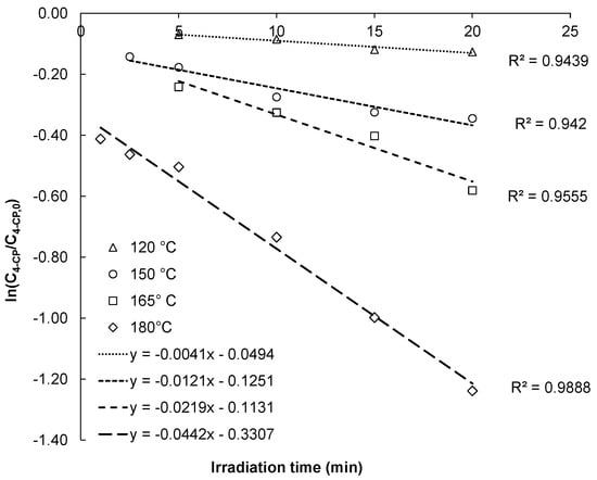 The results of the kinetic evaluation are shown in Figure 1. In this figure, the x-axis represents the holding time of the reaction. This means that at a holding time of 0 min, already some degradation can be observed due to heating of the reaction vessel to its reaction temperature. When evaluating the data of the kinetic experiments, a clear linear correlation (R² of 0.9439, 0.9420, 0.9555, and 0.9888 for respectively 120, 150, 165, and 180 °C) between the natural logarithm of the observed relative concentrations and the reaction time is observed. This linear correlation implies a pseudo first order reaction. The observed reaction rate constants and their respective correlation coefficients can be derived from the data shown in Figure 1 (slope of the obtained straight line) and increase from 0.0041 min−1 at 120 °C to 0.0442 min−1 at 180 °C. From this, the assumption can be made that the reaction rate increases with a factor of 10 approximately when the temperature increases with a factor of 1.5. The obtained reaction rate constants are in the range of what was reported in a previous publication, when the difference in process conditions is taken into account. Asgari et al. [22] investigated the kinetics of the degradation of 4-CP by MW–H2O2 at different process conditions (initial 4-CP concentration 100 mg/L, hydrogen peroxide concentration 6.8 g/L, temperature of 105 °C, and pH = 11). Here they found an observed reaction rate constant of 0.055 min−1.