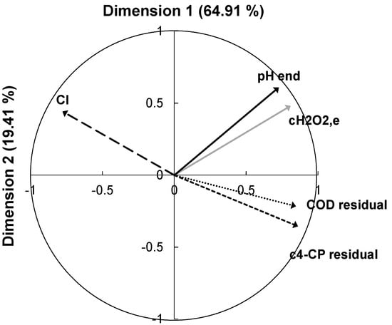 Principal Component Analysis (PCA) was used to investigate possible correlations between the measured output variables. These were the residual 4-CP concentration, the residual COD, the residual H2O2 concentration, final pH, and chloride concentration. The biplot of the PCA analysis showed that during the 4-CP degradation process, better degradable compounds are formed, and the Cl atom is removed from the molecule. Correlations between the residual H2O2 concentration and the residual 4-CP concentration showed that H2O2 consumption was not efficient in the process.