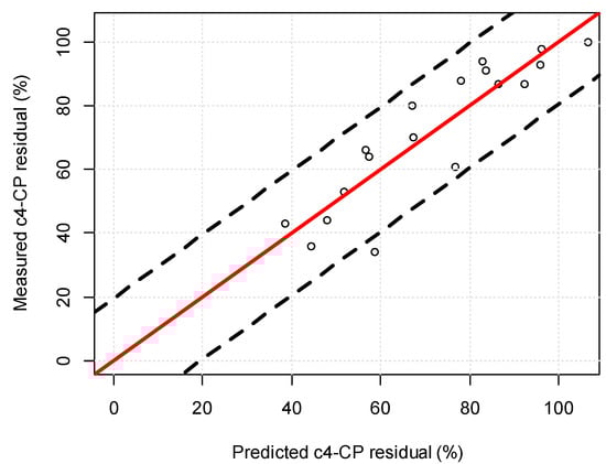 To make sure the predicted values of the model lay close to the actual observations, the predicted values are plotted against the actual observed values. If a good model is obtained, the values must lie in a confidential interval around a straight line with slope 1. The confidential interval (CI) is defined as stated in Equations (10) and (11). The factor t95% stands for the t-value of the inverse of the two-sided Student’s t distribution for a confidential interval of 95%.