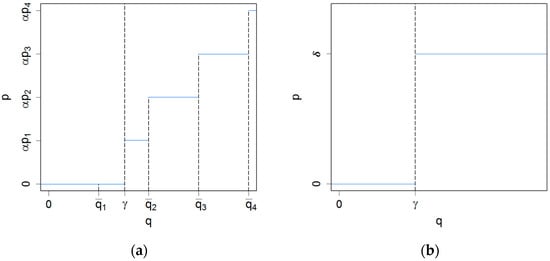 In order to be able to use Equation (4) in the DCC model, we need to solve it for . To this end, we employ the Lambert’s W function, , which is double-valued in the negative domain but uniquely defined in the non-negative domain [68]. Since the demand quantity is restricted to non-negative values, we can treat the function as a single-valued function. Rearranging and applying Lambert’s W function allows us to solve Equation (4) for :