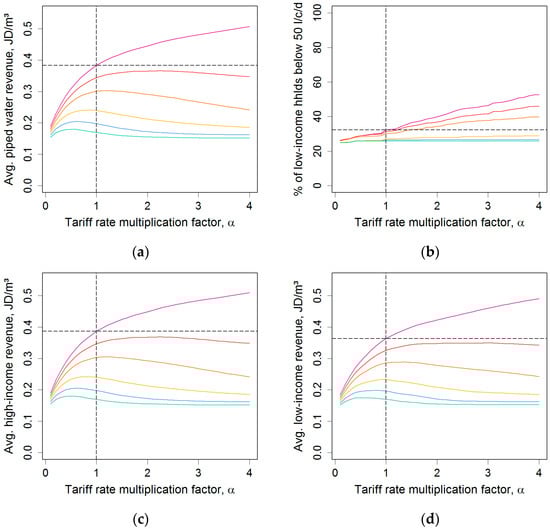 Figure 4b shows that the percentage of low-income households consuming less than 50 L per person per day increases steeply with the tariff rate if the tariff increase threshold is below 50 L per person per day and not at all otherwise. The latter result is a direct consequence of the fact that the incentive to consume less than 50 L per person per day does not change with the tariff rate if the free tariff block reaches up to 50 L per person per day. The comparison of high-income and low-income revenue per m3 in Figure 4c,d show that the degree of cross-subsidization is substantially higher than in simulation experiments 1 and 2 for all parameter combinations. These results indicate that the two-block IBT with a block boundary defined in liters per person per day could theoretically achieve the IBT objective of reconciling cost recovery and affordability via cross subsidization better than either of the two IBTs that had the boundary defined in m3 per household per quarter. Whether these advantages could be achieved in reality depends on whether WAJ and the water utilities would be able to reliably verify the number of persons in each household, for example based on official records. Households would have an incentive to over-report their size. If a verification of the actual size is not possible, then the per capita definition of the block boundaries could create new inequities. Several European cities and regions have implemented tariff block definitions on a per capita basis and at least some of these still seem to exist [7,84]. A systematic review of their performance would, however, be required to better assess the opportunities and obstacles of this approach in practice.