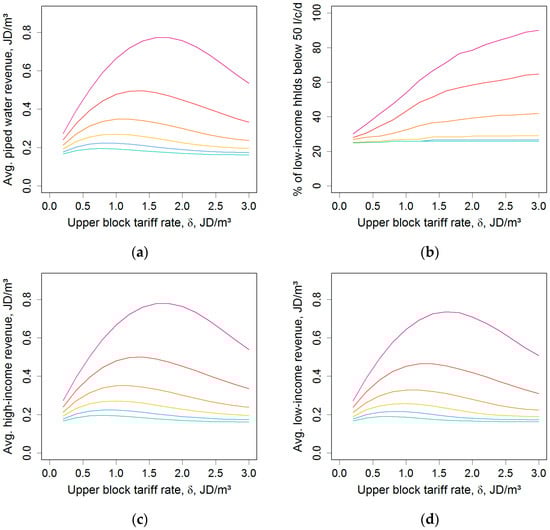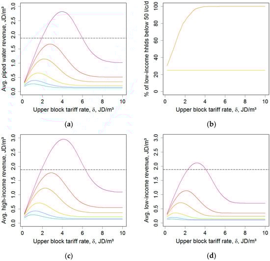 Results of simulation experiment 3, analyzing a two-block tariff consisting of one block free of charge, followed by a second block with a uniform tariff rate, where the boundary between the two blocks is defined in liters per person per day: For various levels of the upper block tariff rate , (a) shows the average revenue per m3 paid by all households; (b) shows the percentage of low-income households consuming less than 50 L per person per day; and (c) and (d) show the average revenue per m3 paid by high and low income households, respectively. The colored curves indicate the following levels of the tariff increase threshold measured in liters per person per day: pink = 10; red = 20; orange = 30; yellow = 50; blue = 75; green = 100. The dotted lines mark the financial costs of water provision of 1.882 JD/m3. Axis labels: l/c/d = liters per capita per day; hhlds = households.