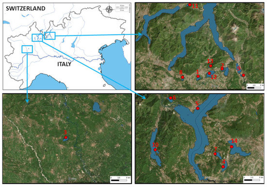 Water samples were collected from fourteen Italian lakes: L. Candia, L. Orta, L. Mergozzo, L. Maggiore, L. Monate, L. Comabbio, L. Varese, L. Piano, L. Montorfano, L. Alserio, L. Segrino, L. Pusiano, L. Annone (W), and L. Olginate. These lakes are located in Northern Italy, included from Piemonte region (45°49′ N, 8°24′ E) and the western part of Lombardia region (45°47′ N, 9°25′ E) (Figure 1).